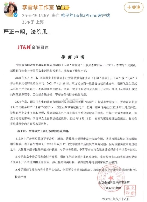 6月17日深夜,网友@老谢同学之你谢哥 发布微博,其自称“曾是李雪琴公司(北京十斤文化传媒有限公司)的股东”,实名举报该公司财务问题,引发网友关注。6月18日,@李雪琴工作室 回应:严正声明,法院见。