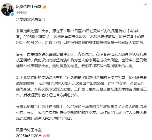 6月20日,@凤凰传奇工作室 发声明称取消演唱会 :因曾毅身体原因,原定于6月27日至29日在天津举办的演唱会取消,筹备中的洛阳站也暂时终止。
